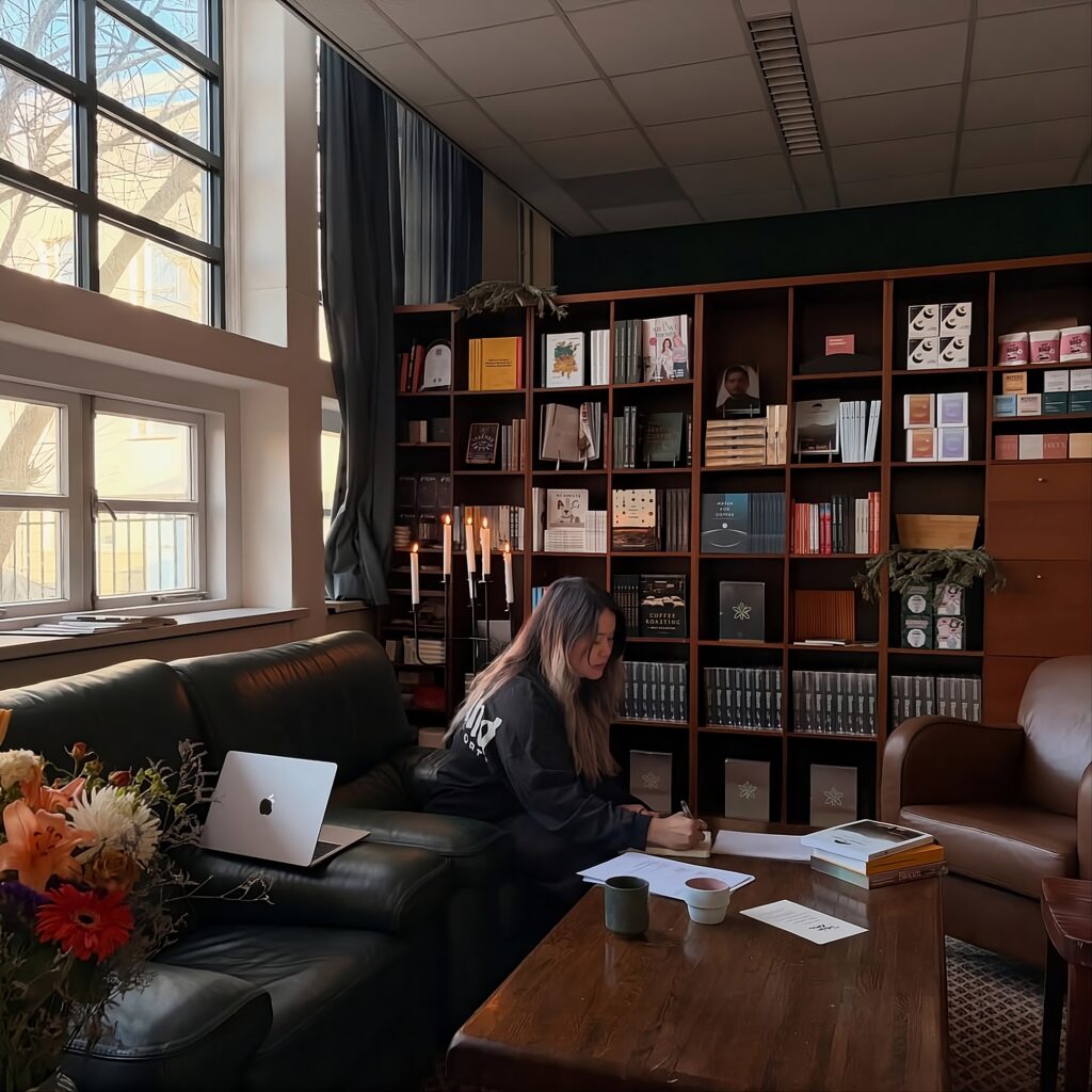 Rak bukunya mencerminkan cara berpikir itu. Sebuah buku anak-anak bisa berdampingan dengan teks teknis tentang ekstraksi espresso. Novel fantasi bertema kafe dapat muncul di samping biografi tokoh industri kopi.