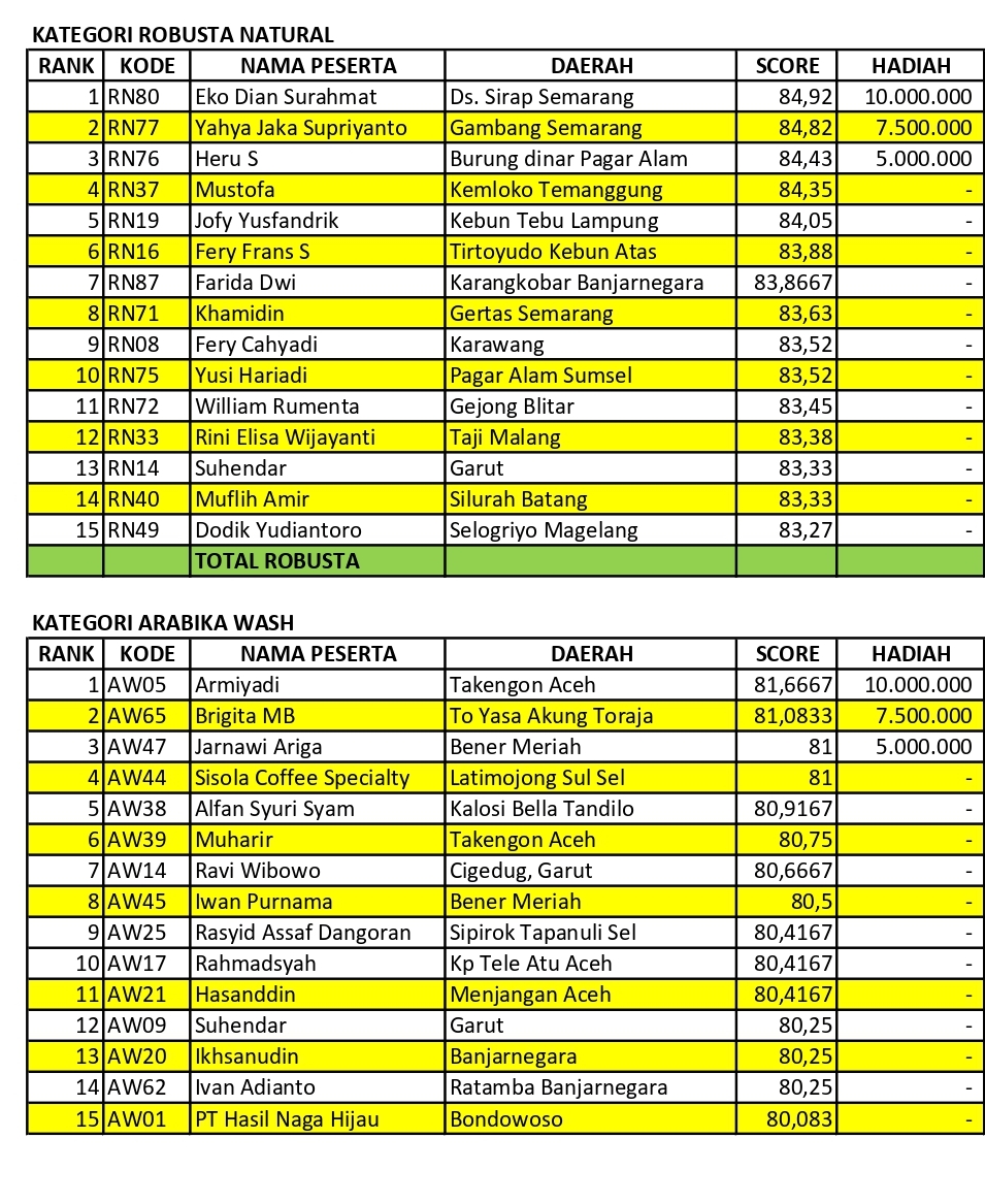 Pemenang Kontes Kopi Nusantara Dongeng Kopi di Jogja Coffee Week 2022 Published 14 September 2022. Size: 955 × 1167 in Lelang Kopi JCW#2 Terjual Ratusan Juta Rupiah < Previous Next >