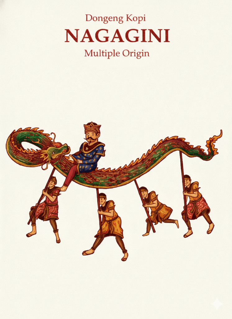 Cerita Nagagini menjadi inspirasi kami untuk menyemat nama multiple origin yang kami hadirkan sebagai salah satu pilihan diantara banyak pilihan cerita rakyat, babad, dongeng, epos, mitologi, sage, dan juga fabel sebagai teman merawat ingatan cerita cerita yang sarat pesan moral, sarat akan refleksi sehari hari. Cerita ini banyak berkembang di daerah Jawa Tengah, oleh sebab itu kopi ini merupakan representasi dari kopi kopi dari Jawa Tengah yang kami racik secara khusus dengan karakter buah buahan manis, seperti permen, dengan kekentalan sedang, dan penuh di mulut.