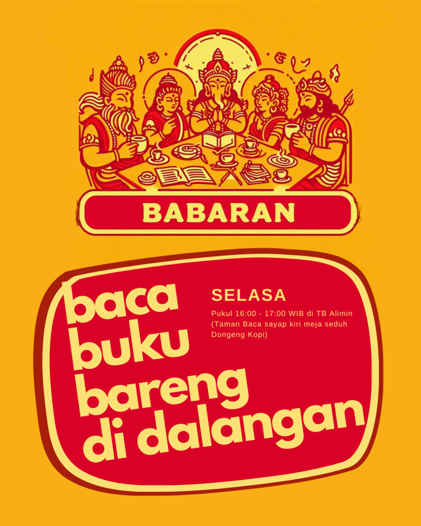 Babaran adalah singkatan dari Baca Bareng di Dalangan. Sebagaimana kebiasaan @dongengkopi yang selalu berangkat dari usulan warga @kerep.dolan, Babaran lahir dari kegelisahan sederhana: tumpukan buku di rumah kian menjulang, tetapi entah mengapa, sulit sekali menamatkan satu pun. Dalam bahasa Jawa, “babaran” berarti melahirkan atau bersalin, sebuah awal, anugerah, dan harapan baru. Ya, harapan untuk kita semua “melahirkan” kembali kebiasaan membaca, tumbuh, dan belajar bersama. Bukankah perintah Tuhan pertama juga senada: “Bacalah”?